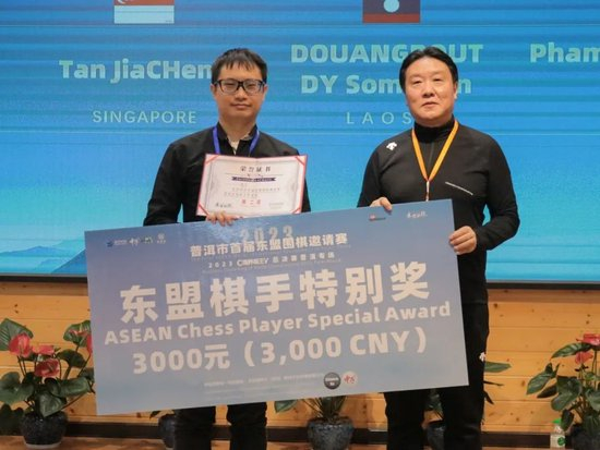 新加坡棋手Tan Jiacheng获得了“东盟棋手特别奖”第二名,颁奖仪式后,我抢到了和他闲聊几句的机会。