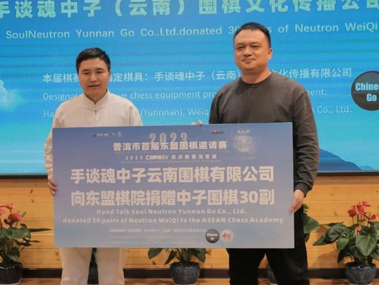 颁奖之后,本届棋赛唯一指定棋具品牌方——手谈魂中子(云南)围棋文化传播公司(以下简称“中子围棋”),委派罗发祥先生向普洱东盟棋院捐赠精品棋子三十副,赛事承办方之一的普洱辰宇科技有限公司(以下简称“辰宇科技”)总经理查锦代表普洱东盟棋院接受了这一珍贵的赠品。