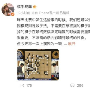 作为职业棋手,战鹰发文表示:“昨天比赛中发生这些事的时候,我们还可以去尝试着理解是规则的差异,因为中国围棋规则是数子法,不需要在意被提的棋子放到了哪里,而日韩规则是数目法,提掉的棋子在最终数棋决定输赢的时候需要重新填回到棋盘上,所以每一颗提的子都很重要,不准确的话会影响到最终的胜负。