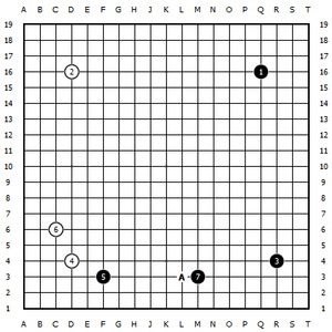接着白棋发现黑1对星位控制的薄弱,而黑棋经营的重点放在了棋盘下面。