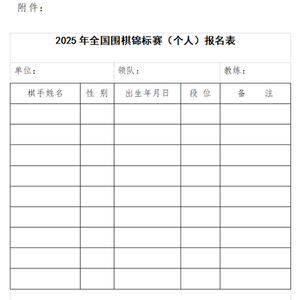 (一)各单位和个人报名均使用统一下发的报名表(附后),邮件标题为队伍或个人名称。按照要求填写、盖章、扫描后于2025年3月31日17:00前一式两份分别发到本规程指定的报名邮箱,逾此期限的报名一律无效。完成报名、缴费工作后,参赛名单将在中国围棋协会官方公众号公示。