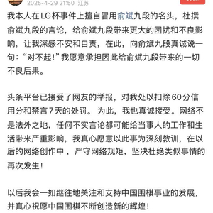 4月29日,头条博主 “翩舟” 发文,就LG杯事件中不实言论文章公开向俞斌道歉。