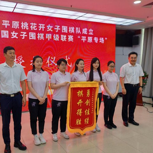 成立仪式上,山东平原桃花开围棋队教练陈盈携队员王爽、李小溪等登台,山东省体育局副局长栾风岩与平原县委书记王玉东授予 “棋开得胜・勇创佳绩” 锦旗,饱含对队伍赛场出彩的期待,这支新生力量即将带着使命,奔赴全国女子围甲联赛征程。