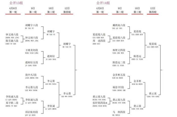4月12日将进行各个小组的决赛,公开组五场中韩大战:屠晓宇VS朴廷桓、檀啸VS卞相壹、胡耀宇VS李元荣、张紫良VS李志贤、赵斐VS沈载益;另有两场中国大陆与中国台湾棋手的较量:王春晖VS陈祈睿、王舜博VS赖均辅;其余均为内战。