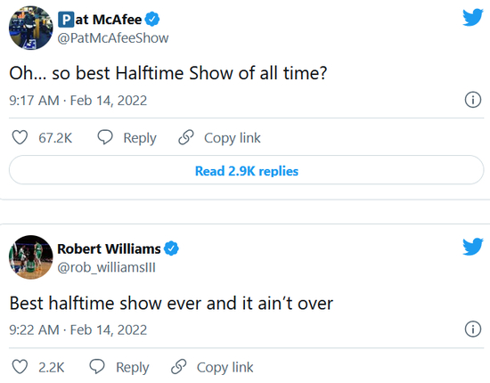 “美国杨毅”A-史密斯也在推特更是惊叹,这一届的中场秀精彩程度足可以和迈克尔-杰克逊1993年的太空步表演媲美。
