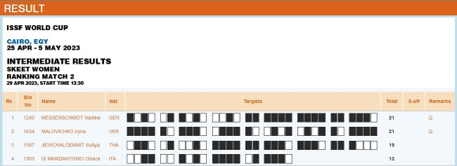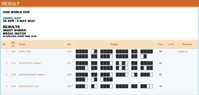 在最终的奖牌赛中,年仅18岁的小将江伊婷以35中,夺得金牌,意大利选手西蒙娜-斯科切蒂以33中获得银牌,德国选手纳迪娜-梅舍施密特以23中摘得铜牌。