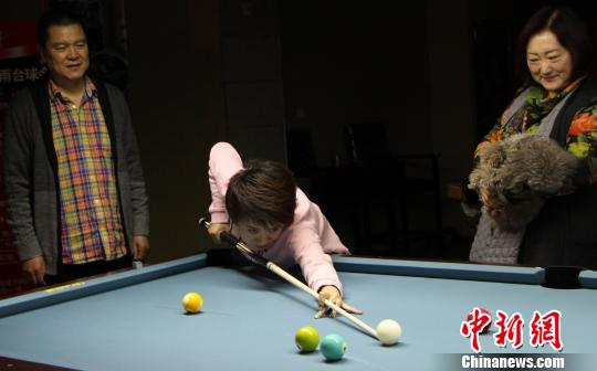 在唐山韩雨台球馆,韩雨在家人的陪伴下苦练基本功,备战台北安利杯。 韩冰 摄