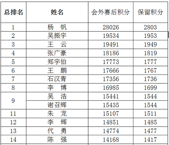 注:所有选手新积分为2015历史积分的10%,四舍五入