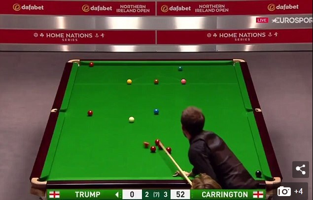 当天,特鲁姆普的对手是卡灵顿。特鲁姆普丢掉首局本有机会追平比分,在第二局打单杆59分不慎失误,卡灵顿单杆连得56分61-59仅两分优势再下一城。特鲁姆普刚刚以单杆64分扳回一局,便又被卡灵顿以一杆79分拉开距离。接下来特鲁姆普单杆75分继续以2-3紧追不放。