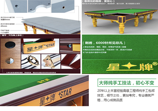 星牌31年来一直遵循大师精神,就是热爱你所做的事胜过这些事给你带来的钱,专注、严谨、耐心、精雕细琢、追求完美、淡泊名利。在台球桌方面,星牌通过科技、工艺、人才、设备、材料等四位一体的品质体系,保证产品精准、稳定、标准、耐用。