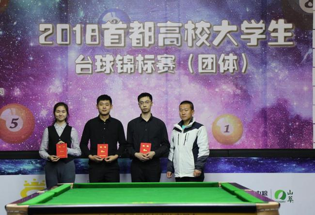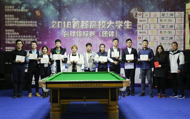 经过两天的激烈角逐,北京市大学生体育协会主办,中国传媒大学、北京市大学生体育协会台球分会、北京星牌伟业体育用品有限公司联合承办的2018首都高校大学生台球锦标赛(团体)11月18日落下帷幕。中国传媒大学一队获得冠军,这也是中国传媒大学获得的第一个团体赛冠军。中国矿业大学二队获得亚军,中国传媒大学二队获得季军。