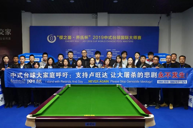 4月9日,“樱之崮•乔氏杯”2019中式台球国际大师赛揭幕战打响,来自20个国家的30名球员齐聚这项中国原创的国际顶级赛事。适逢卢旺达大屠杀25周年纪念活动,大师赛组委会和国际球员在比赛间歇一道发声“Never Again”,中式八球国际联合会主席乔冰也在社交媒体上发表讲话,缅怀逝者,愿灾难永不重来。
