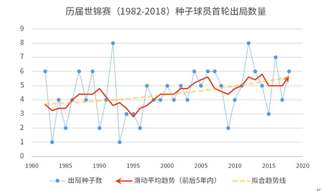 世锦赛从1982年开始采用正赛32签位、前16种子直接进入正赛的赛制,延续至今已有38个年头。下图统计了过去37年里种子球员首轮出局的数量。