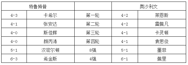 第14局,特鲁姆普再次展现出“无论什么球型我都能破百”的硬实力,单杆123,并且拿到了赛点。绝境之下的奥沙利文发起了最后反击,一杆难度同样不低的单杆135挽救一个赛点(最后黑球没打);但特鲁姆普没有再多给一次机会,他用单杆84分成功收掉了这场华丽流畅的比赛,与一年前一样的赛场、一样的对阵、一样的比分9-7,特鲁姆普再次击败奥沙利文,两人历史总交手记录变为13对13。