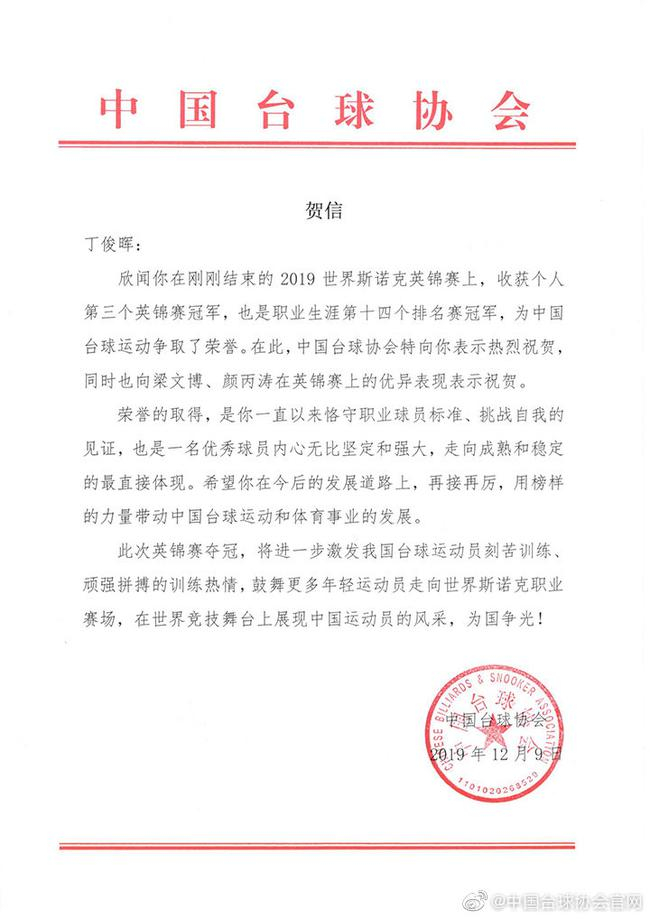 中国台球协会在贺电中写道: