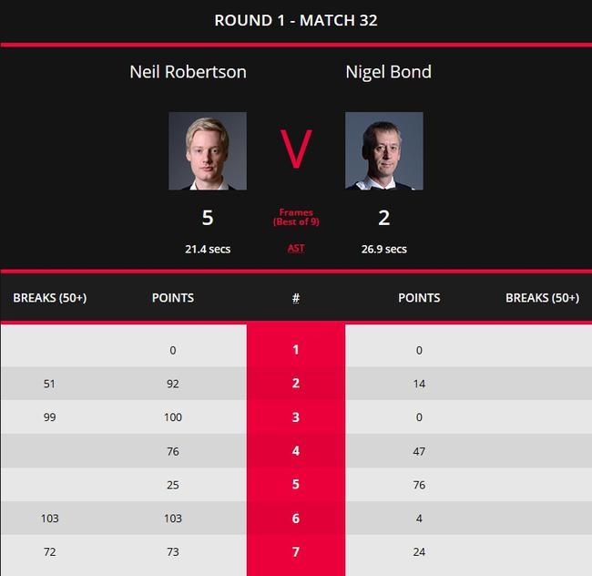不过这并没有影响到罗伯逊的状态,5-2战胜了邦德。比赛中罗伯逊一杆103分,还有51分、99分和72分的三杆50+,邦德全场没有一杆50+。