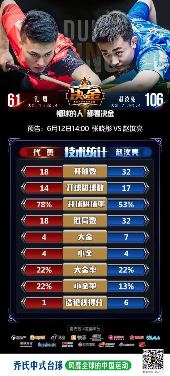 懂球的人,都看决金。6月11日,决金中式九球球王争霸赛第二季迎来了一场汹涌澎湃的“前浪”与“后浪”之战——“一代天王”代勇VS“帝皇星”赵汝亮。最终赵汝亮取得7个大金,106:61战胜代勇。