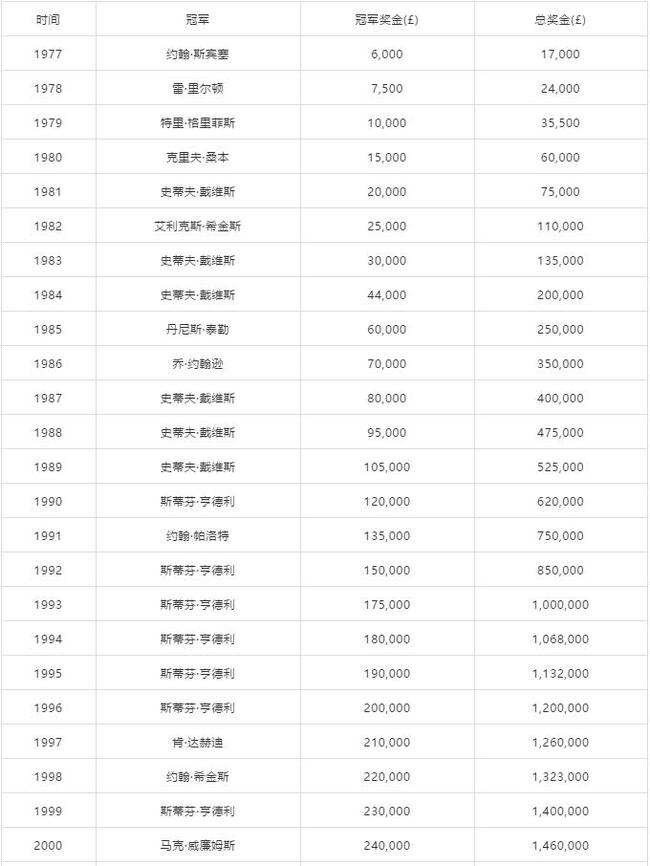 世锦赛冠军奖金在连续4年上涨后,终于在今年“涨停”至50万英镑。1977年首次在克鲁斯堡举办以来,世锦赛一直是斯诺克的标志性赛事,而世锦赛43年来的奖金变迁,也堪称斯诺克这项运动健康程度的“晴雨表”。