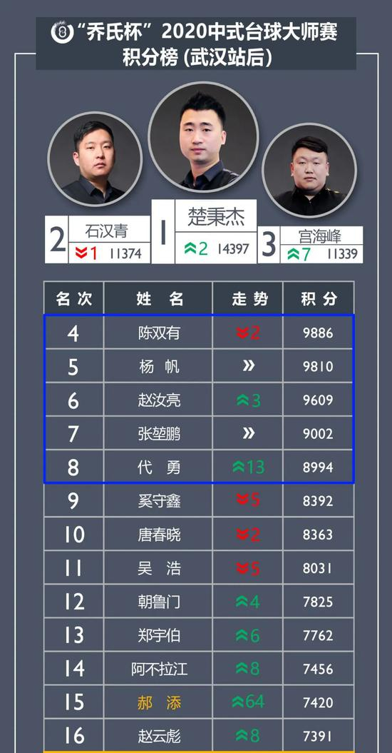 大师赛武汉站后积分榜 陕西硬汉火箭式蹿升64位