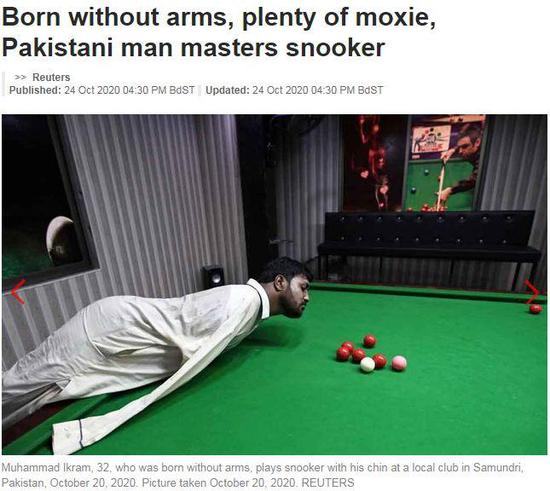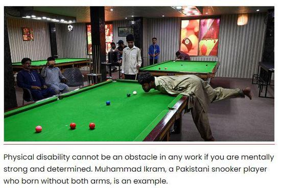 斯诺克赛场上,用球杆击球是所有人的共识。但是伊克拉姆用自己的下巴代替了球杆。他不是为了博人眼球,也不是为了练某种绝技,而是他生来没有双臂。