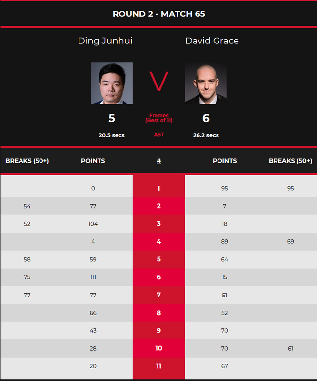 第11局,丁俊晖开杆。几杆防守后,丁俊晖打进右侧中袋红球上手,但单杆3分后,红球不进。格雷斯左侧底袋红球不进留机会,丁俊晖打进再次上手,单杆17分后做防守。又是几次推杆后,格雷斯拼进左侧顶袋红球上手,单杆14分后做防守。丁俊晖解球失误,被罚4分。格雷斯再次拼进长台右侧底袋红球上手,虽然没能打进最后一颗红球,但凭借单杆49分,以67-20锁定胜局,大比分6-5逆转卫冕冠军丁俊晖,晋级第三轮。