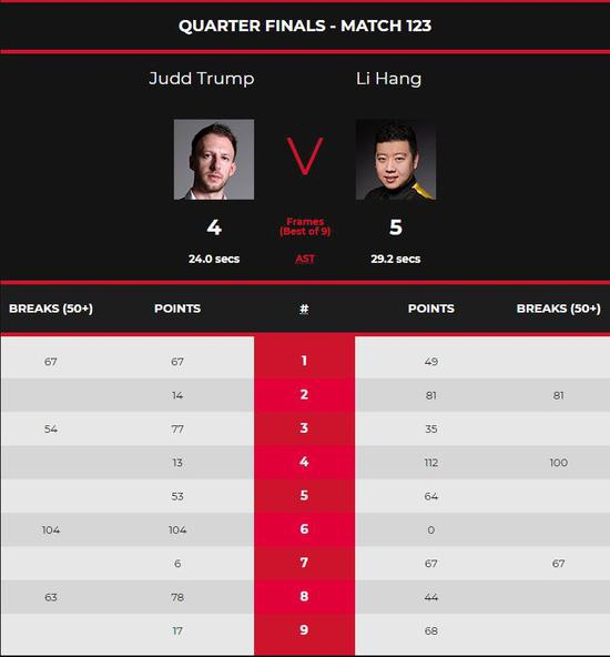 李行的本场胜利,终结了特鲁姆普在本赛季“本土系列赛”18连胜的纪录。一天前,世界排名37位的李行在八分之一决赛4比3爆冷击败了伦敦大师赛冠军宾汉姆。