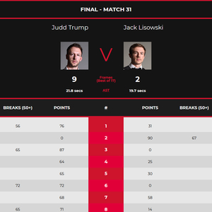 第11局,利索夫斯基进攻失误漏球,特鲁姆普轰出单杆119分,以119-0为这场比赛画下完美句号。