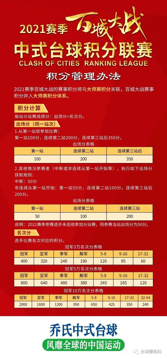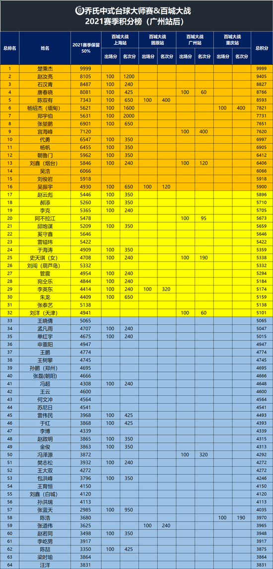 5月8日,“乔氏杯”百城大战中式台球积分联赛(华南赛区·广州站)落下帷幕,最新乔氏中式台球大师赛&百城大战积分榜新鲜出炉。5月11日,“乔氏杯”2021中式台球大师赛分站赛(广州站)即将开赛,根据榜单,广州站的32强种子选手已经落位。