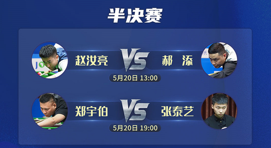 5月19日,经过激烈的争夺,“乔氏杯”2021中式台球大师赛(广州站)4强已经诞生,他们分别是赵汝亮、郑宇伯、郝添、张泰艺。明日13:00、19:00,半决赛将轮番上演