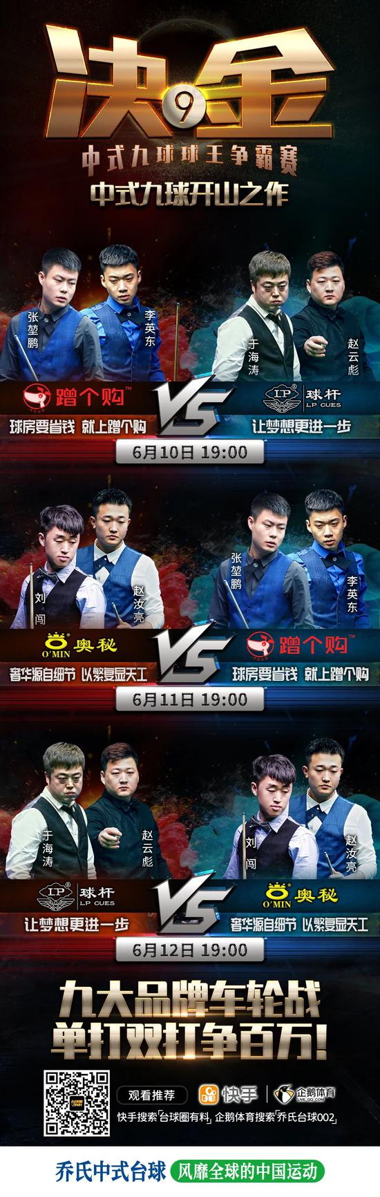 你方唱罢我方登场,6月10日,决金中式九球球王争霸赛开战,蹭个购商城战队、LP战队、奥秘战队将迎来新一轮的厮杀,锁定快手“台球圈有料”账号、企鹅体育“乔氏台球002”官方直播,看直播,抽大奖,精彩好礼拿到手软!