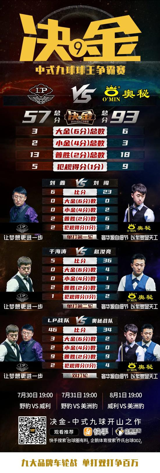 7月30日-8月1日,决金中式九球球王争霸赛精彩继续。野豹战队、威利战队、美洲豹战队强势登场、两两对抗,究竟鹿死谁手,敬请锁定请锁定快手“台球圈有料”账号、企鹅体育“乔氏台球002”官方直播,不见不散!