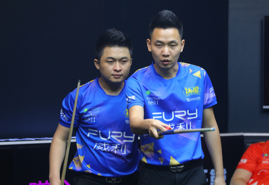 双打轮开始,蹭个购战队继续发起攻势,第25局打出的一杆小金,让他们的比分领先到46:32。但随后,威利战队在第27局连续打出1大金1小金,44:46,开始追击比分。30局结束,双方比分48:47,威利战队仅落后一分。