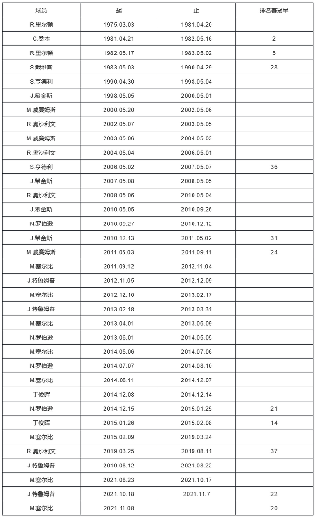 斯诺克世界排名体系自1976/77赛季开始实施以来,共有11位选手荣登‘世界第一’宝座。