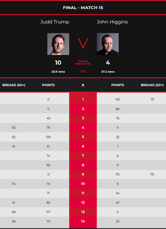 那次世锦赛决赛,希金斯其实打得并不差,全场他有4杆破百,外带4杆50+,放在任何一场世锦赛决赛里,这都是很不错的表现了。但特鲁姆普全场打出来7杆破百(世锦赛决赛纪录),外带8杆50+,也就是说在他赢球的18局里,小特有15局几乎都是一杆打死对手。