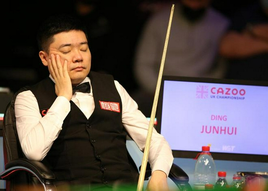 英锦赛上,丁俊晖被抓拍到的闭眼镜头 图据视觉中国
