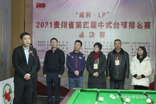 毕节市体育局党组成员、副局长朱卫国、FURY威利品牌经理刘凯在开幕式上致辞,袁京代表裁判员宣誓,路垚作为运动员代表宣誓,贵州省社会体育管理中心主任蒋菊,毕节市体育局党组成员、副局长朱卫国,贵州省社会体育管理中心副主任、贵州省台球运动协会副主席田猛一起为赛事开杆,伴随着贵州省社会体育管理中心主任蒋菊宣布比赛开幕,翘首以盼的“威利·LP”2021贵州省第四届中式台球排名赛总决赛奏响了开赛最强音。
