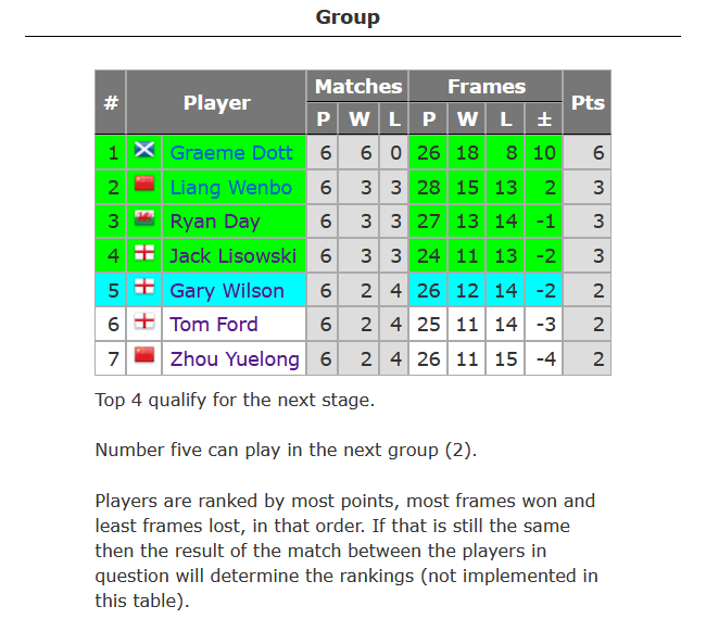 多特则是以3-2的相同比分先后战胜瑞恩-戴和梁文博,最终以6战全胜积6分,排名小组第一;瑞恩-戴和利索夫斯基则与梁文博一样,都是3胜3负积3分,分列第三和第四;G-威尔逊则以2胜4负积2分排名小组第五。
