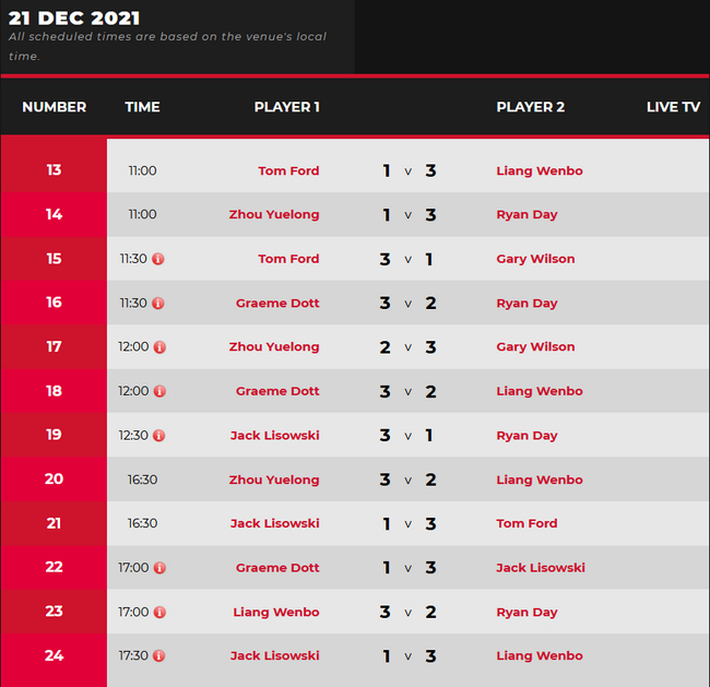 斯诺克冠军联赛(邀请赛版本)第一小组第2比赛日赛果