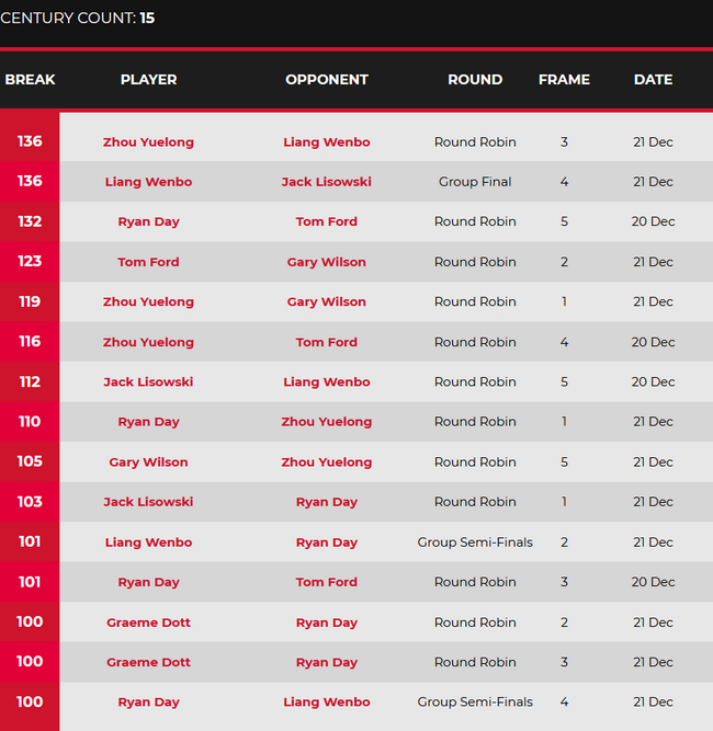 周跃龙则是在以1-3(0-111(110)、97(63)-38、17-73(73)和25-92(92))负于瑞恩-戴、2-3(126(119)-0、0-65(63)、102(57)-7、53-68(61)和0-105(105))输给G-威尔逊之后,在中国德比中轰出本组单杆最高分(136分),3-2战胜梁文博。最终,他以6战2胜4负积2分,排在小组倒数第一被淘汰。
