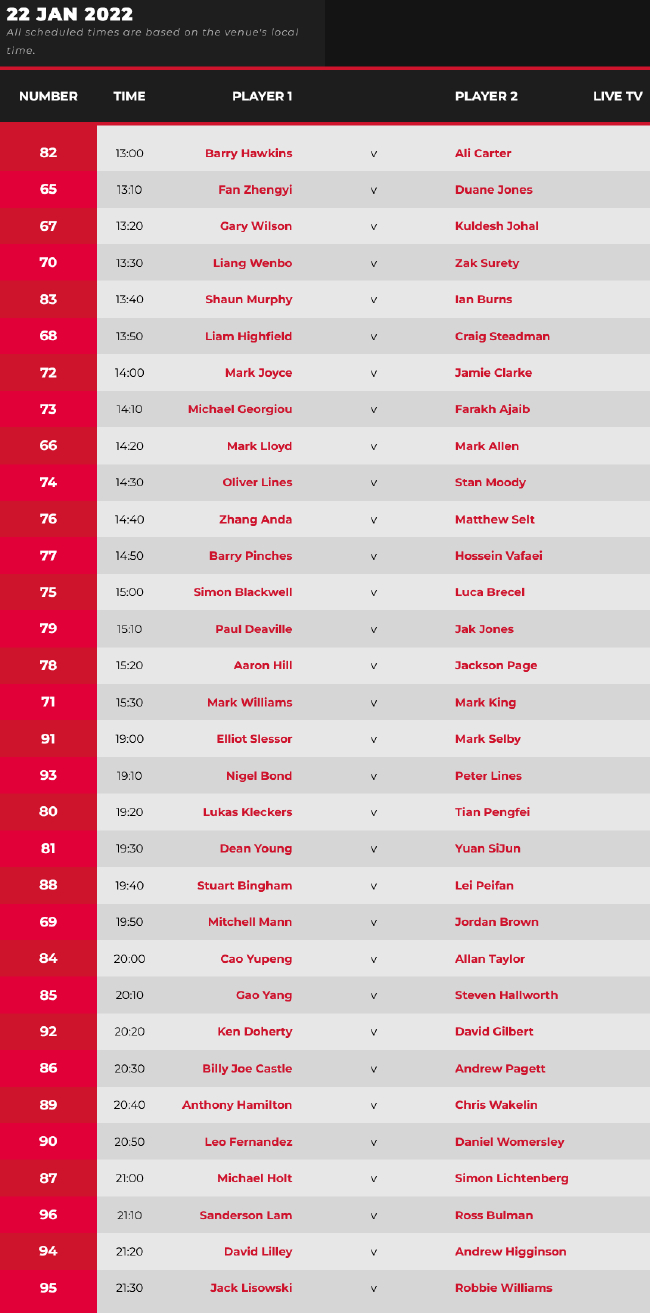 北京时间1月22日凌晨,2022斯诺克单局限时赛结束了次日争夺。在所进行的全部32场比赛中,总共有11位中国选手出战。其中,只有田鹏飞、张安达和袁思俊3位选手顺利晋级下一轮,而赵心童、颜丙涛、周跃龙、肖国栋、徐思、斯佳辉、白朗宁和张健康则全被淘汰。另外,上届亚军马克-艾伦、斯图尔特-宾汉姆、巴里-霍金斯、卢卡-布雷切尔等名将都顺利过关。