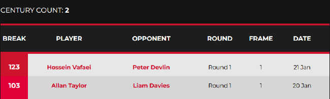 另外,在第2日的比赛中,还是有人轰出了单杆破百:伊朗选手侯赛因-瓦菲在对阵利彼得-德夫林的比赛中,轰出了1杆单杆123分,以124(123)-7获胜。这也是本次比赛到目前为止的单杆最高分。