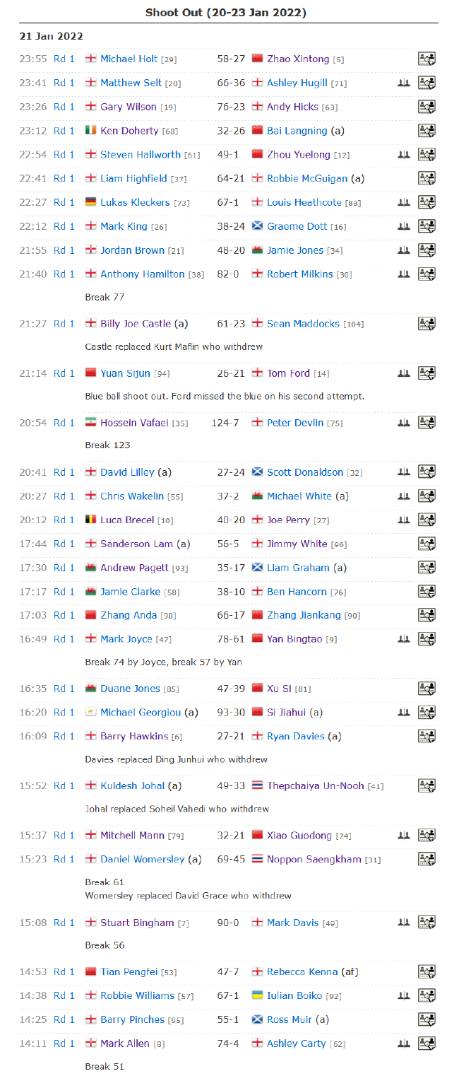 赵心童以27-58不敌迈克尔-霍尔特;打出单杆57分的颜丙涛,以61(57)-78(74)负于打出单杆74分的马克-乔伊斯;周跃龙以1-49输给了史蒂文-霍尔沃斯;白朗宁26-32惜败于肯-达赫迪;徐思以39-47不敌杜安-琼斯;斯佳辉以30-93输给迈克尔-乔治乌;肖国栋以21-32负于米切尔-曼。