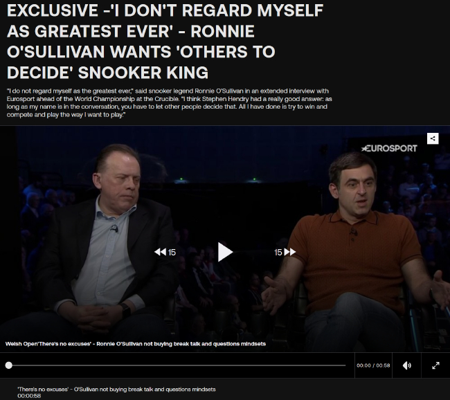 北京时间4月10日,随着2022斯诺克世锦赛的日益临近,传奇球星罗尼-奥沙利文的关注度也日益攀升。在《欧洲体育》最新的采访中,“火箭”表示,他并不认为自己是史上最佳,因为他相信,这场决定谁是斯诺克GOAT的讨论,决定权在与其他人。