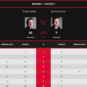 在首日第三时段进行的2场比赛中,马克-塞尔比作为卫冕冠军,继续进行与杰米-琼斯的揭幕战第二阶段比拼。在之前进行的第一阶段比赛中,“磨王”凭借2杆破百和3杆60+,大比分6-3领先。