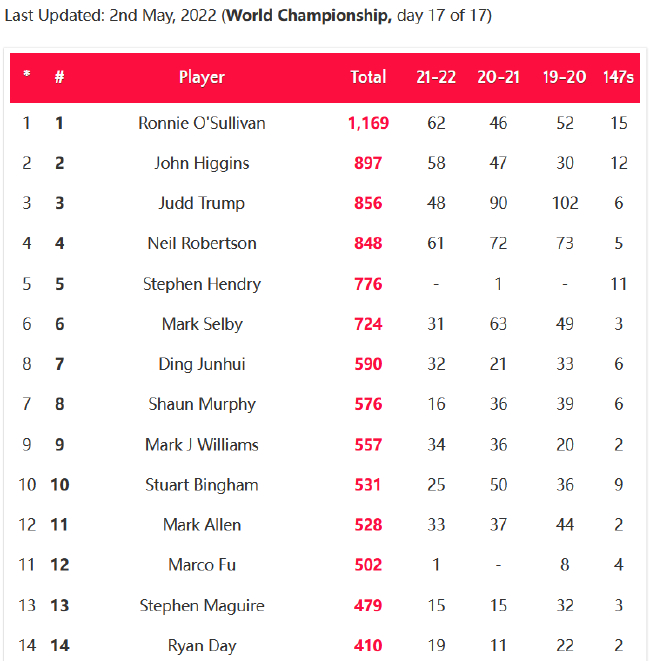此外,尽管没能在决赛中打出第4杆破百,没能追平目前由马克-威廉姆斯和亨德利共同保持的单届世锦赛单杆破百纪录(16杆),但他还是以15杆破百刷新了个人在单届世锦赛上的单杆破百纪录,同时也让他在历史单杆破百榜上,以1169杆继续稳居第一,甩开排名第二的约翰-希金斯(897杆)272杆之多。同时,他在本赛季总共打出了62杆破百,超越尼尔-罗伯逊(61杆),成为本赛季打出单杆破百次数最多的人。