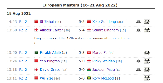 2022斯诺克欧洲大师赛正赛第3比赛日第一时段赛果: