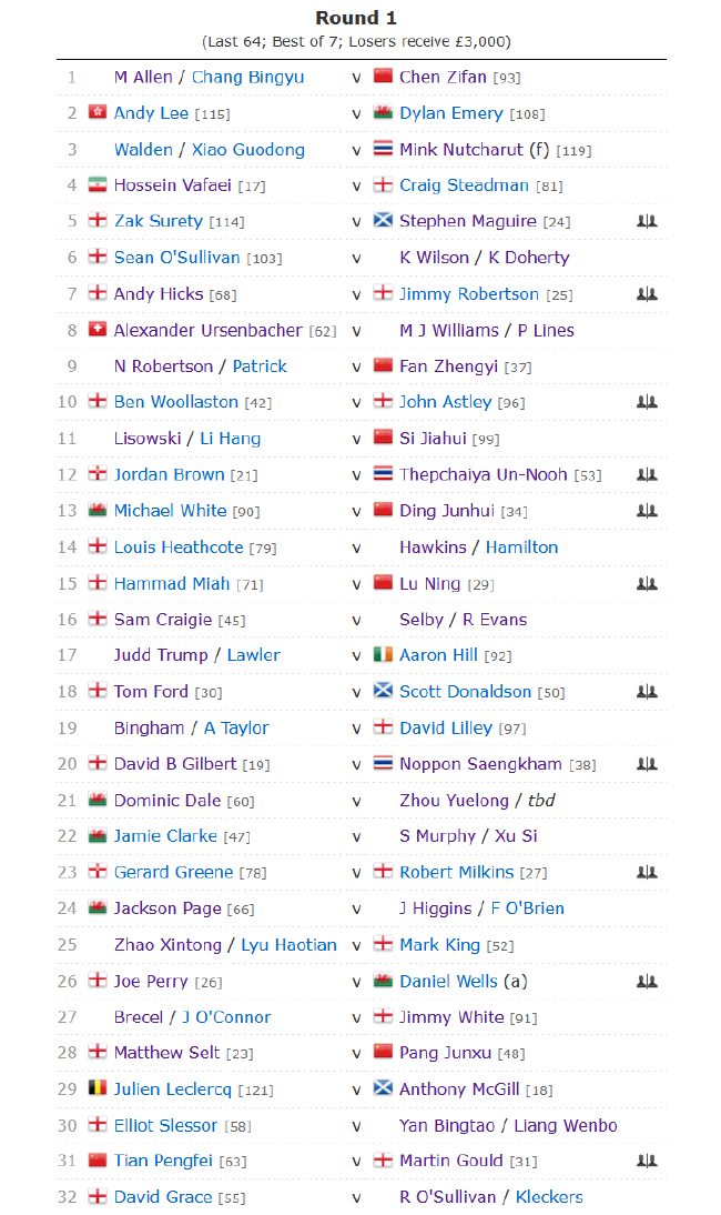 包括傅家俊、李俊威和吴安仪3位中国香港选手在内,共有27位中国球员参加资格赛,其中,有9人的比赛将在正赛期间进行。最终,出战的18人中,只有丁俊晖、鲁宁、陈子凡、范争一、斯佳辉、庞俊旭、田鹏飞和中国香港选手李俊威顺利晋级正赛,而赵剑波、袁思俊、曹宇鹏、张安达、吴宜泽、彭弈淞、张健康、雷佩凡和中国香港名将傅家俊、女将吴安仪则被淘汰出局。