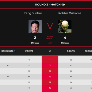 第四局,丁俊晖再次凭借单杆86分,以86(86)-19实现单局逆转,再次扳平。第五局,罗比-威廉姆斯再次打出单杆73分,以74(73)-22将大比分第三次超出,并率先拿到赛点。第六局,英格兰人也没给丁俊晖多少机会,凭借单杆53分,他再次以54(53)-0胜出,大比分4-2晋级第三轮。