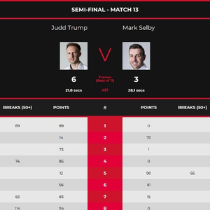 休息回来,塞尔比也打出个人全场唯一1杆60+,以90(66)-12和81-56连追2局,再次将大比分扳为3-3平。然而关键时刻,特鲁姆普连续发威,在接连打出1杆80+和1杆破百后,他以83(83)-15、114(114)-0和75-0连胜3局,大比分6-3胜出,率先晋级决赛。