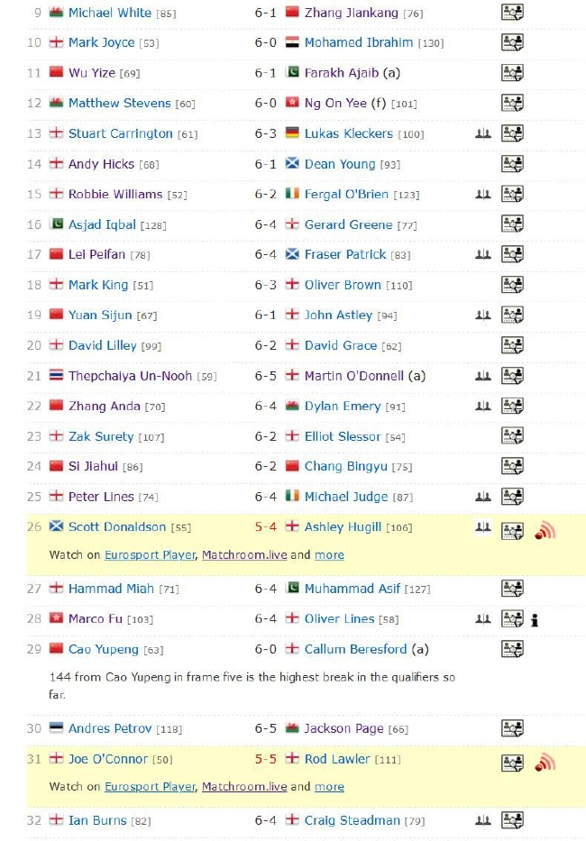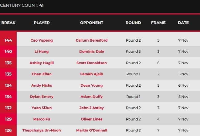 另外,曹宇鹏在对阵英格兰选手卡勒姆-贝里斯福德的比赛中,展现出了强大的火力,在连续6局中,他共打出了1杆破百和5杆60+,最终以100(87)-26、73(72)-34、78(74)-0、84(84)-23、144(144)-0和86(67)-26连胜6局,大比分6-0横扫晋级第三轮。其中,曹宇鹏在第五局轰出了资格赛到目前为止的单杆最高分(144分)。